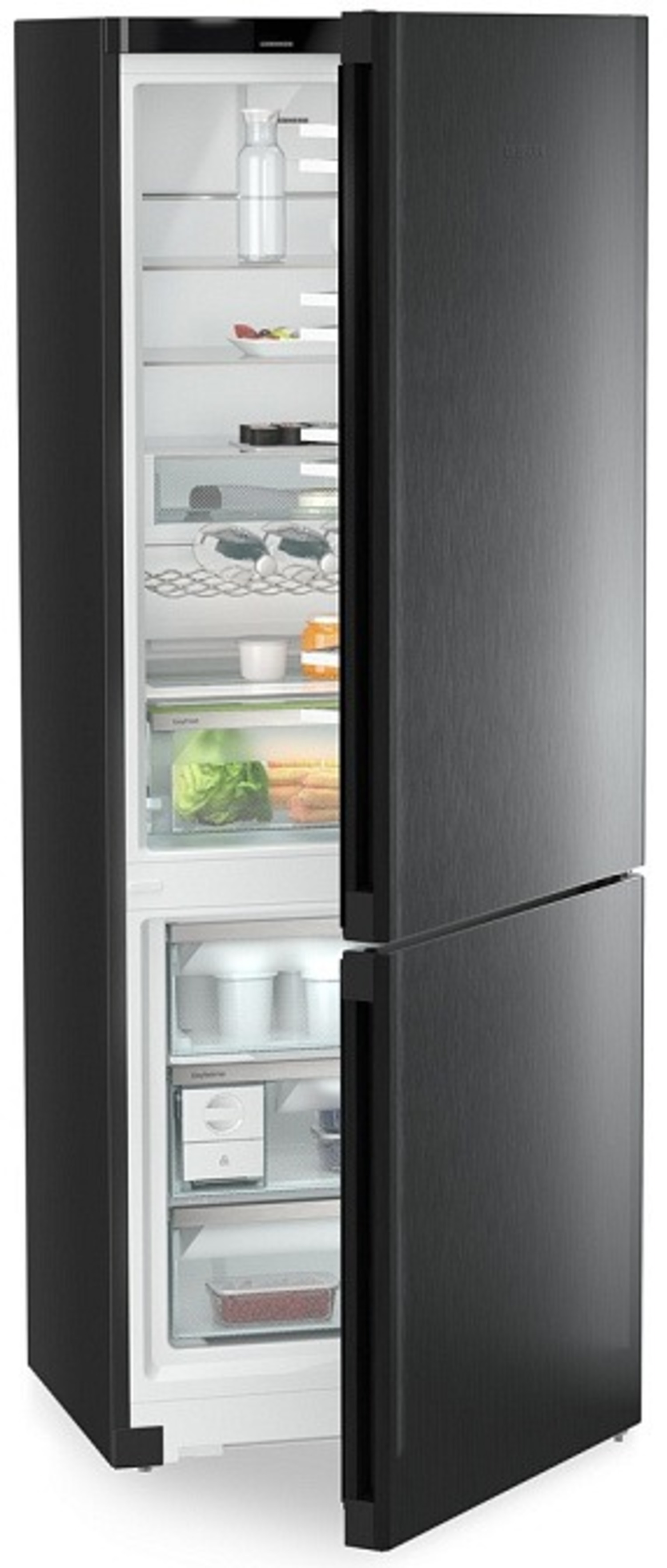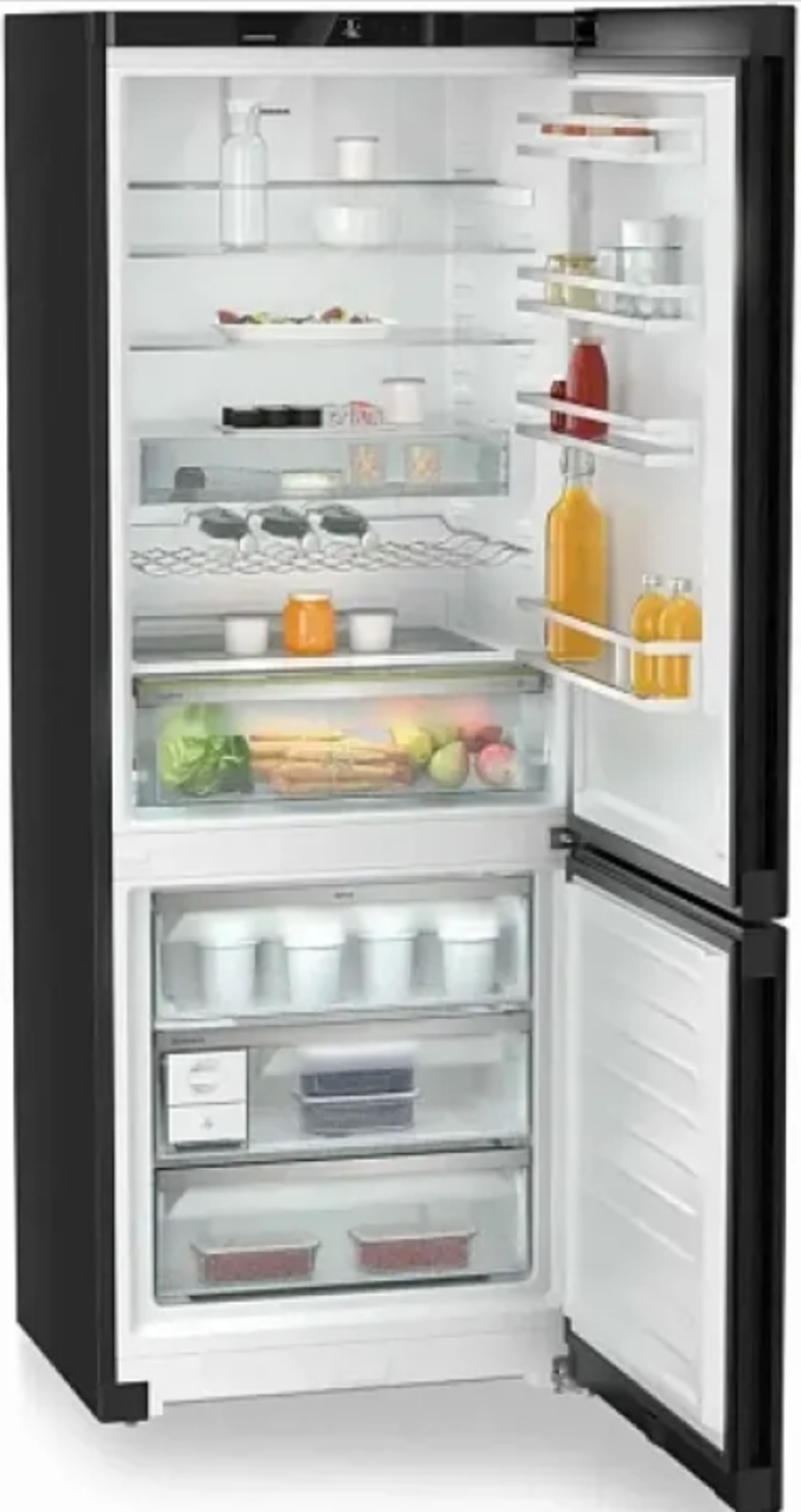 Внутреннее пространство холодильной камеры объемом 348 литров организовано максимально рационально. Шесть полок из закаленного стекла, пять из которых регулируются по высоте, предоставляют возможность гибкой настройки. Зона свежести EasyFresh и контейнер VarioSafe обеспечивают длительное хранение продуктов, сохраняя их свежесть. Автоматическая система размораживания и циркуляционное охлаждение PowerCooling поддерживают оптимальный микроклимат внутри. Морозильная камера объемом 106 литров расположена снизу и оснащена системой NoFrost, что избавляет от необходимости ручного размораживания.